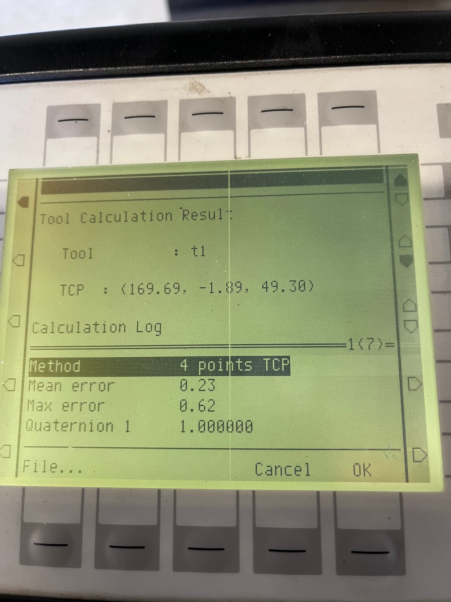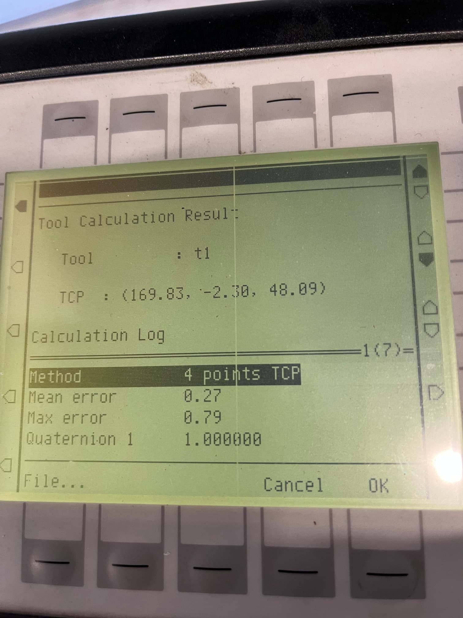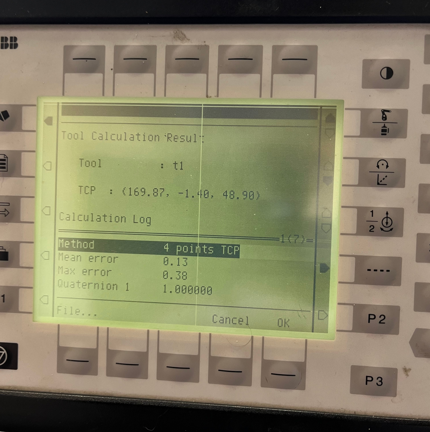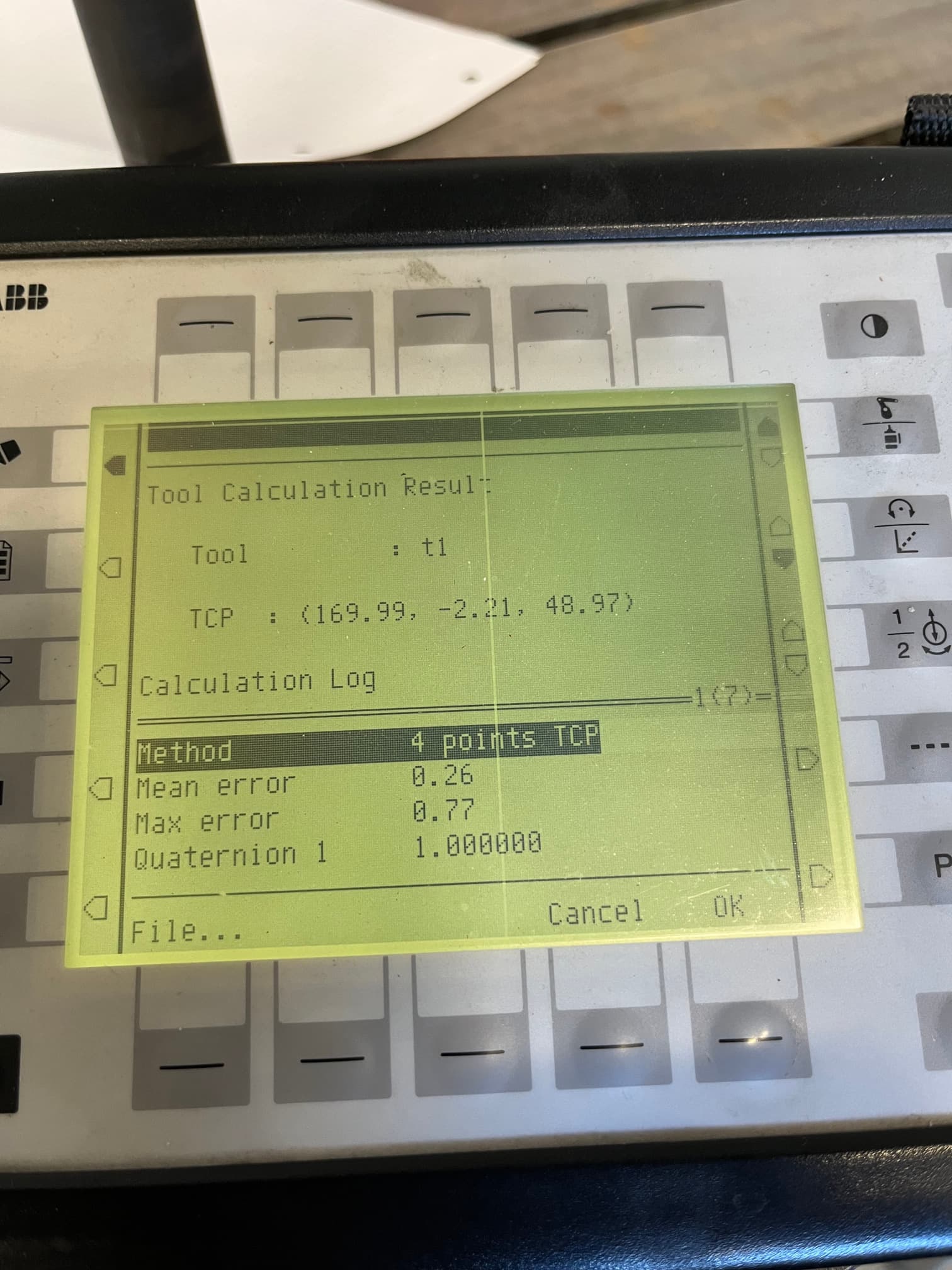 Mathematically, only 3 different positions and orientations are needed to calculate the TCP. However, when 4 points and orientations are used, error estimates can be calculated and displayed on the teach pendant as shown below: