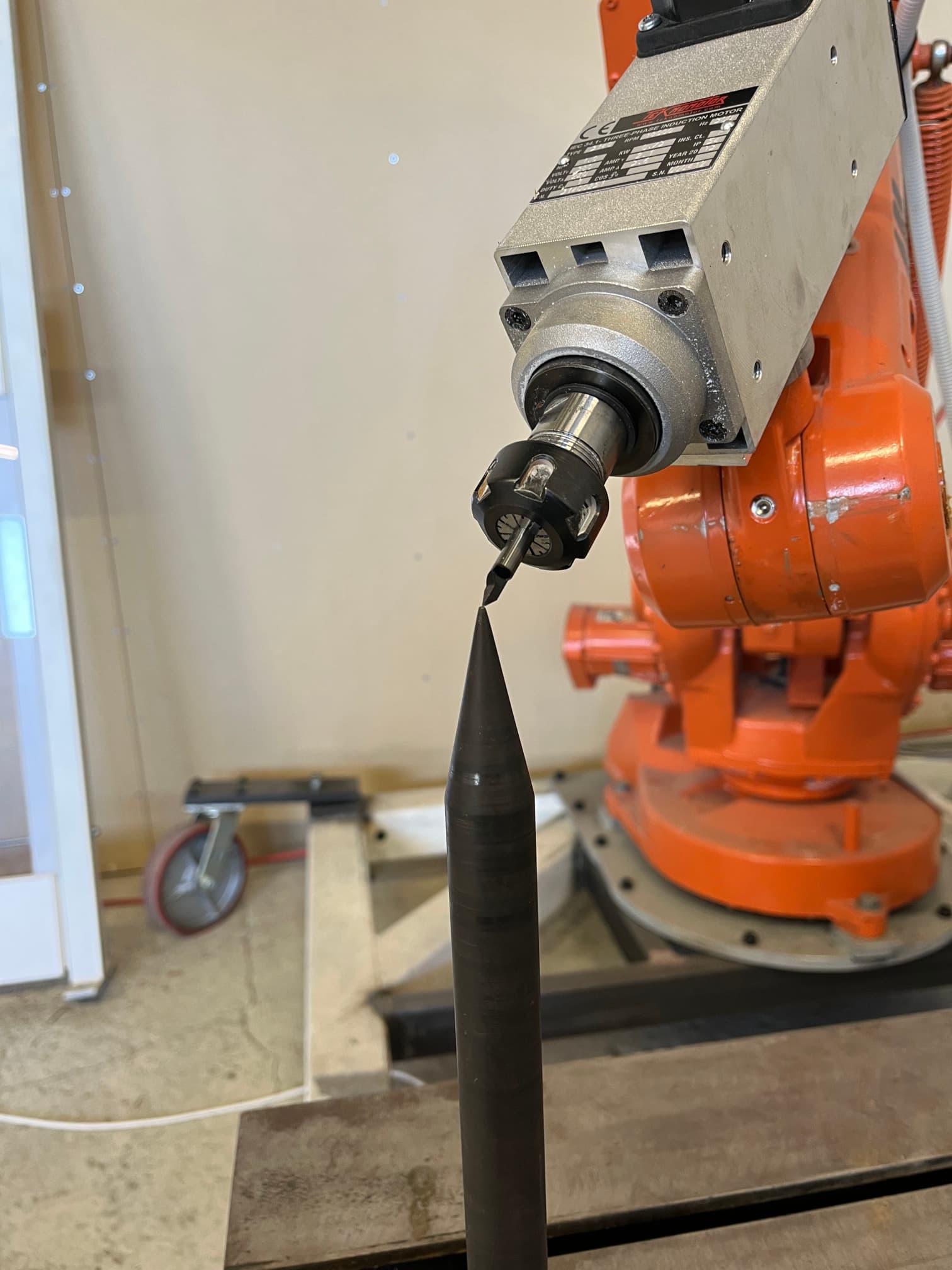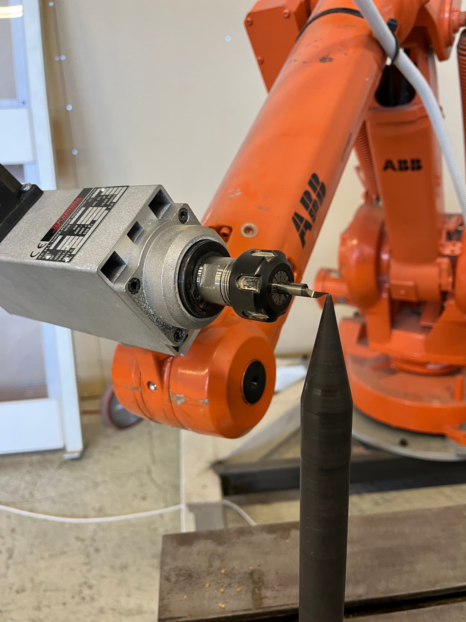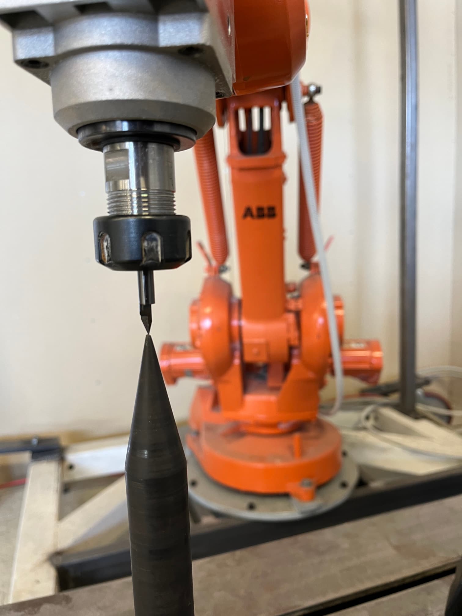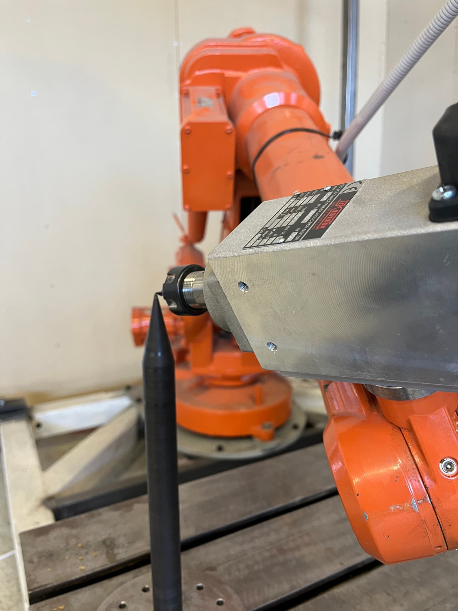 When calibrating the tool of an industrial robot using the 4-point method, a sharp calibration tool can be used. Ideally, this calibration tool has a sharp point which you can position in your working cell. When using the 4-point method, you position the tool center point (TCP) of the robot as accurately as you can against the sharp calibration tool, using different orientations. Examples of 4 such positions and orientations are shown in the photos below: